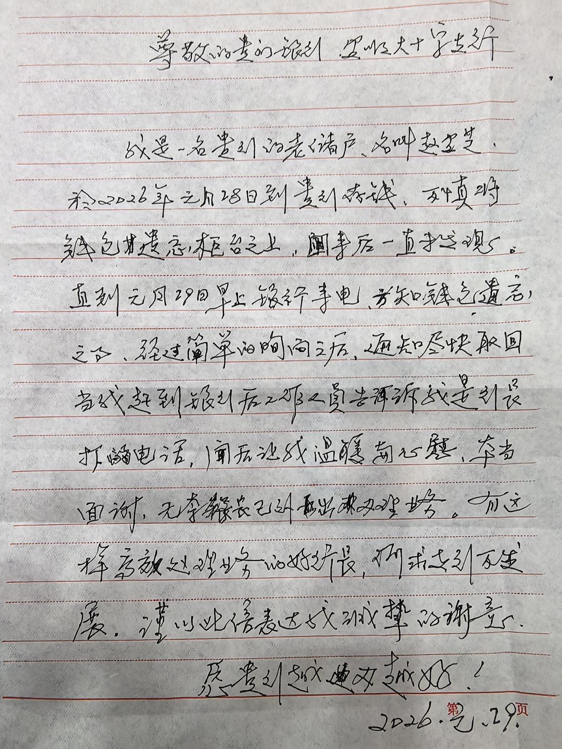 1月29日,赵阿姨因有事要忙直到半夜12点才拖着疲惫的身躯回到家。本就眼睛不好的她,不顾劳累与不适,执意要将这份感激写下来。这份凌晨两点的真情流露,字里行间的滚烫谢意,正是对支行贴心服务的最高褒奖。 ( 王宇)