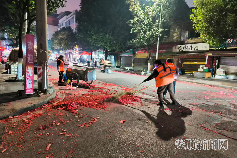 爆竹辞旧,灯火映岁。当千家万户围炉守岁、共享团圆时,城市的街头依旧有身影穿梭忙碌。在西秀区金钟广场,东关环卫所中一班班长张明和同事们手持扫帚簸箕,在夜色与烟花中默默清扫,用坚守守护着城市的洁净。今年,是她从事环卫工作的第八年,也是连续第八个除夕夜坚守在岗位上。