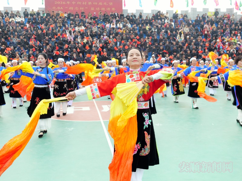 活动现场,篮球竞技与屯堡地戏、红歌串烧、百人舞蹈等民俗节目同台“绽放”。哨声吹响,比赛开始,运球、突破、投篮——年轻运动员们在场上拼尽全力,场下观众的助威呐喊声此起彼伏。