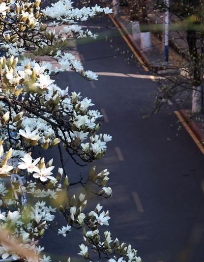 朝晖路上,79株白玉兰正开得盛大,洁白花瓣在蓝天下莹润如脂。