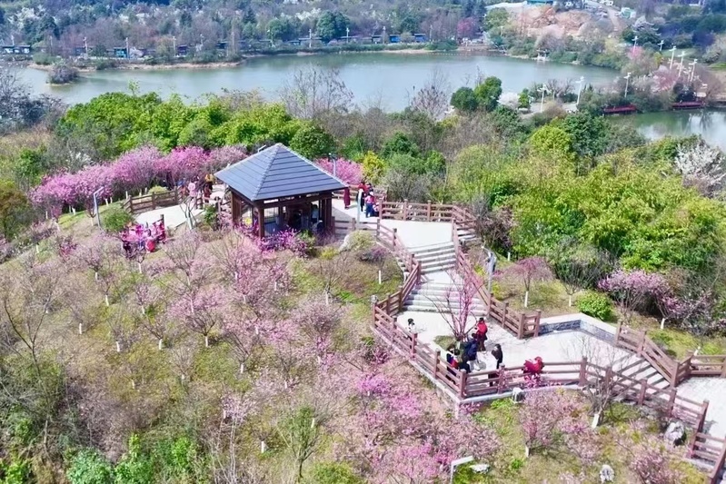 观山湖公园里,梅花沿着木栈道次第绽放,有人在长椅上晒太阳,有人在花树下慢跑。