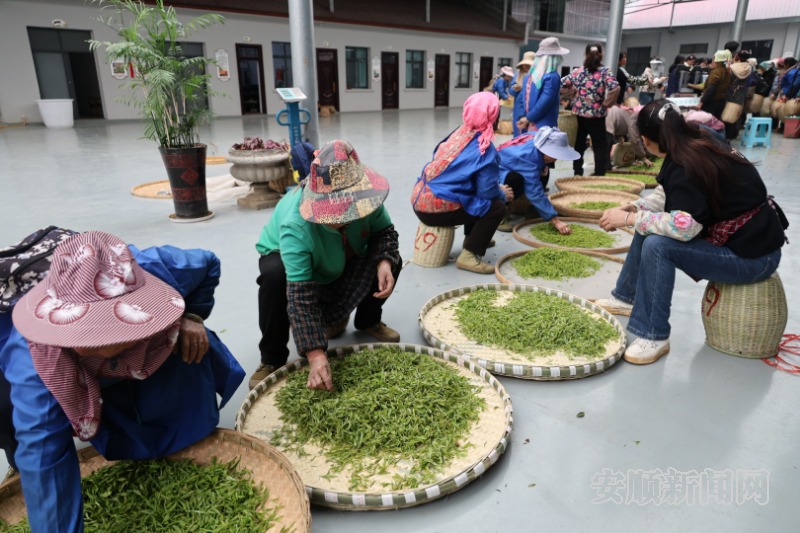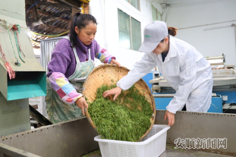 茶山上采撷忙碌,加工车间内机器轰鸣。在安顺御茶村茶业有限责任公司茶叶制作车间,制茶师傅分工明确,经过摊凉、揉捻、烘干、炒制等工序,鲜叶逐步变成茶香四溢的成品茶。