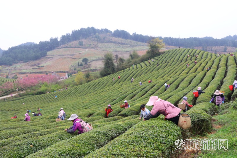 安顺御茶村茶业有限责任公司基地管理负责人殷燕勤介绍,公司茶园面积共2300亩,因今年开春较早,头茬春茶自3月8日已开始采摘,预计春茶采茶期将持续40天。目前茶山每天有采茶工约600人,高峰期超过1000人。为抢抓晴好天气,采茶工作十分繁忙,连午餐也安排在茶山上解决。